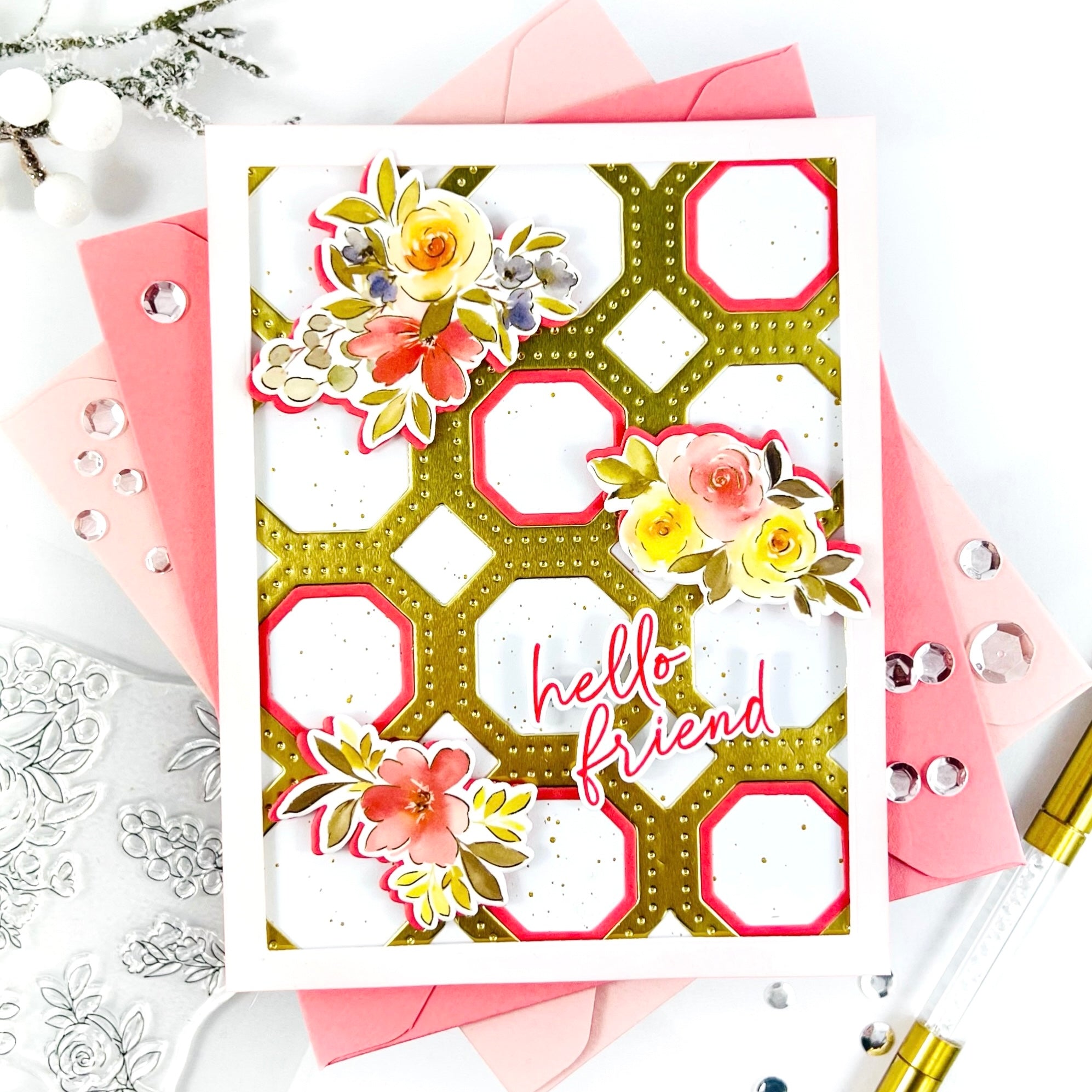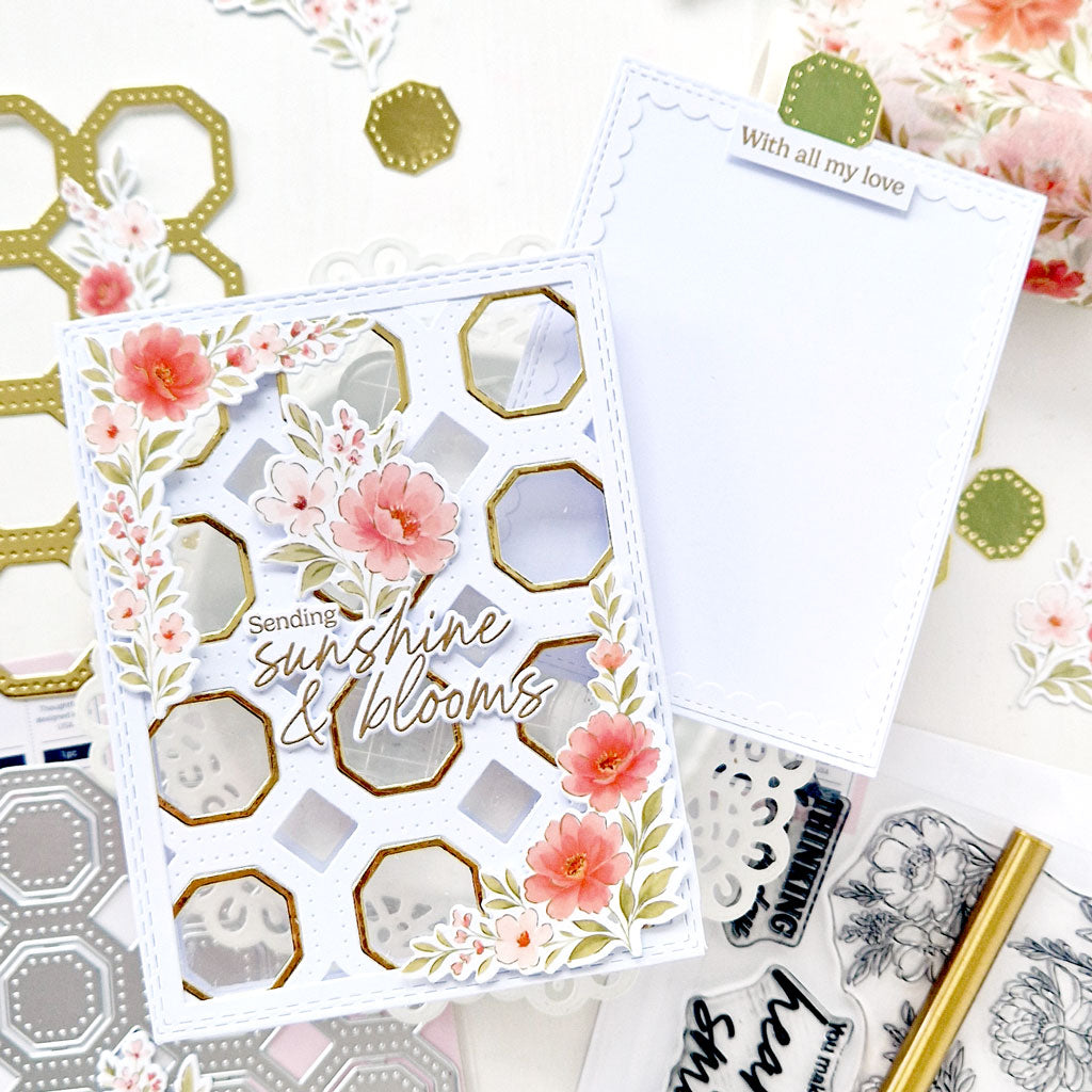 Design striking cards with the Octagon Grid coverplate die. This unique pattern combines bold octagons, diamonds, and dotted details. The structured design works beautifully with florals, sentiments, and layered elements. Create modern shaker windows, elegant tone-on-tone panels, or colorful geometric backgrounds. Your cards will feel fresh and eye-catching with minimal effort.