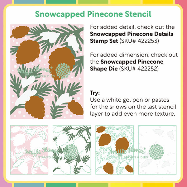 This 4-layered stencil creates layered pinecones, branches, and snowy accents with ease. The numbered layers help you build up color and depth step by step using inks or pastes. For even more possibilities, pair this stencil with the Snowcapped Pinecone Details Stamp Set for added detail or the Snowcapped Pinecone Shape Die for extra dimension.