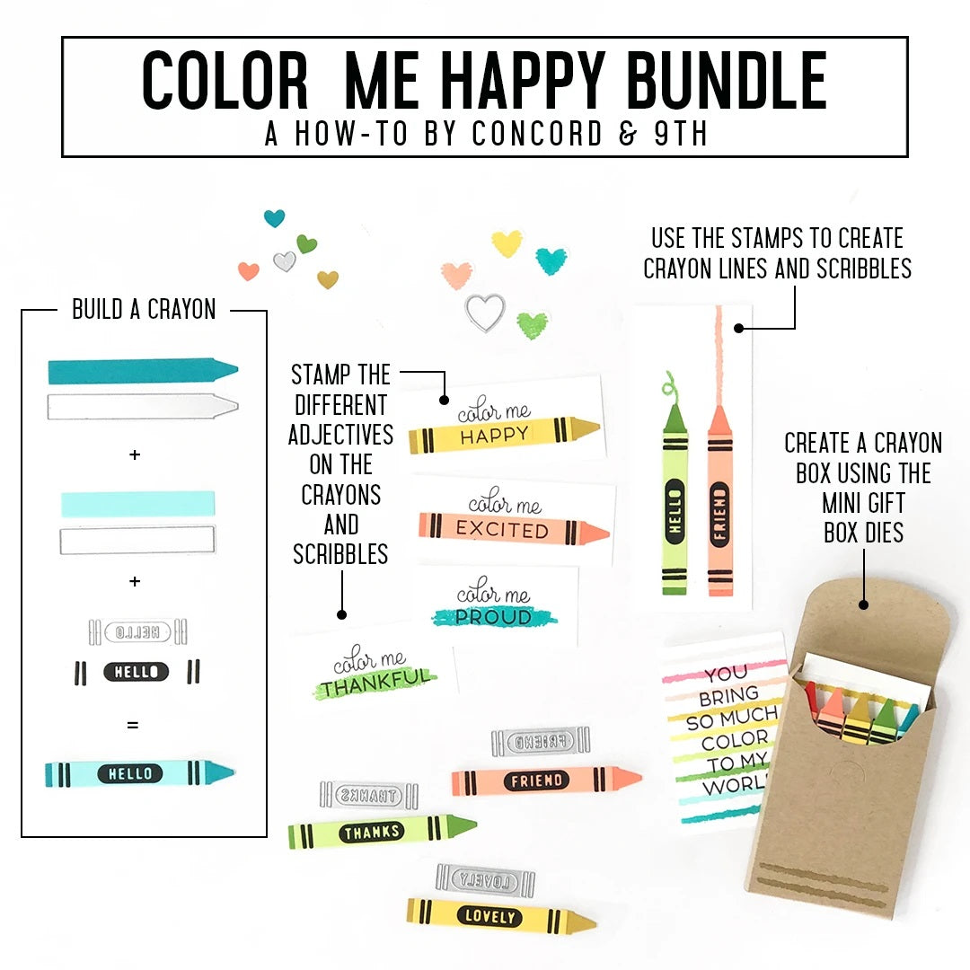 Piece together a rainbow of crayons with the Color Me Happy Dies! Use these dies on their own or alongside the coordinating Color Me Happy Stamp Set. The crayons are sized to fit inside the Mini Gift Box Dies to make an adorable crayon box! 8 pieces.