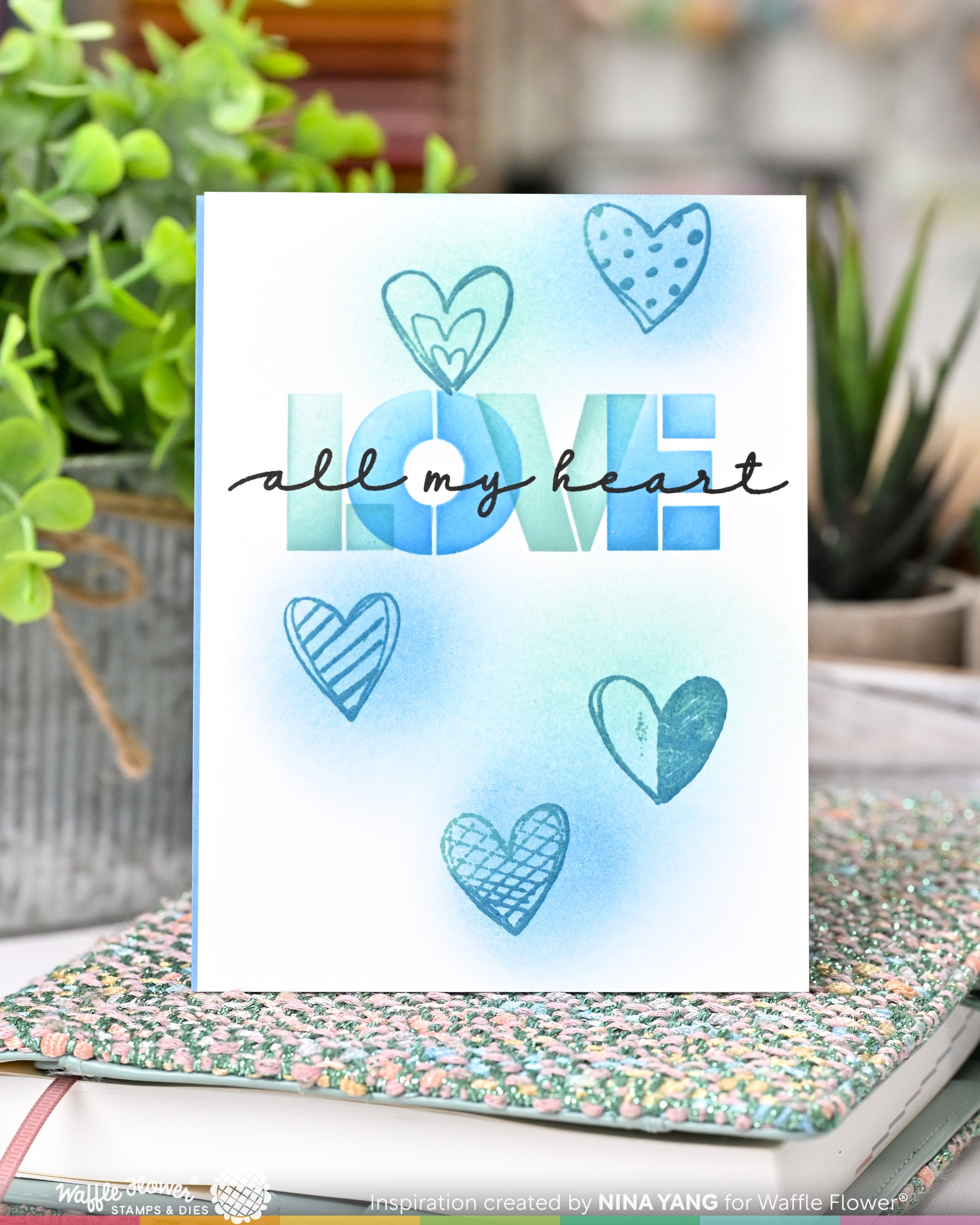 Set of 29 stamps featuring a variety of hearts in a sketchy hand drawn style with 6 separate sentiments on a theme of love