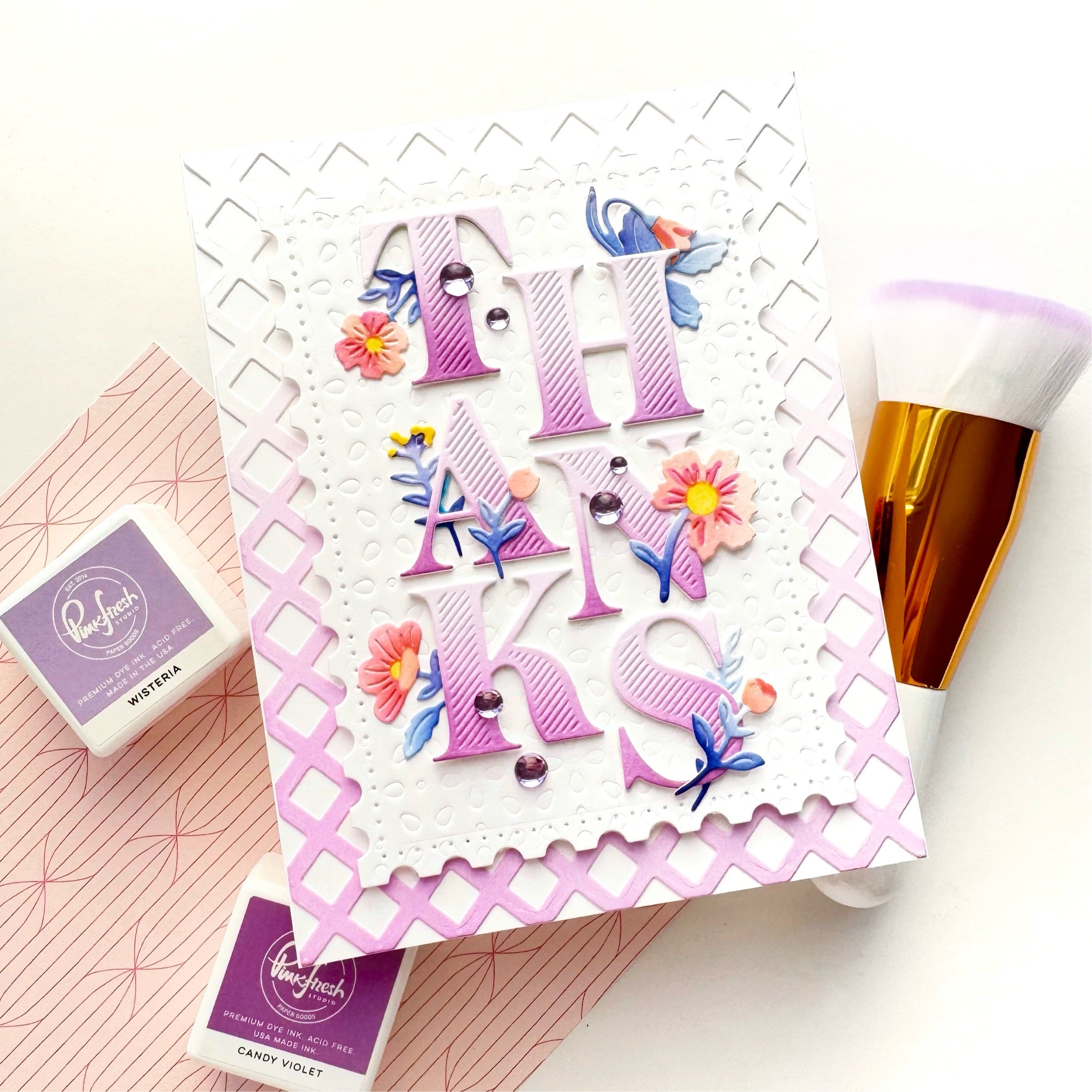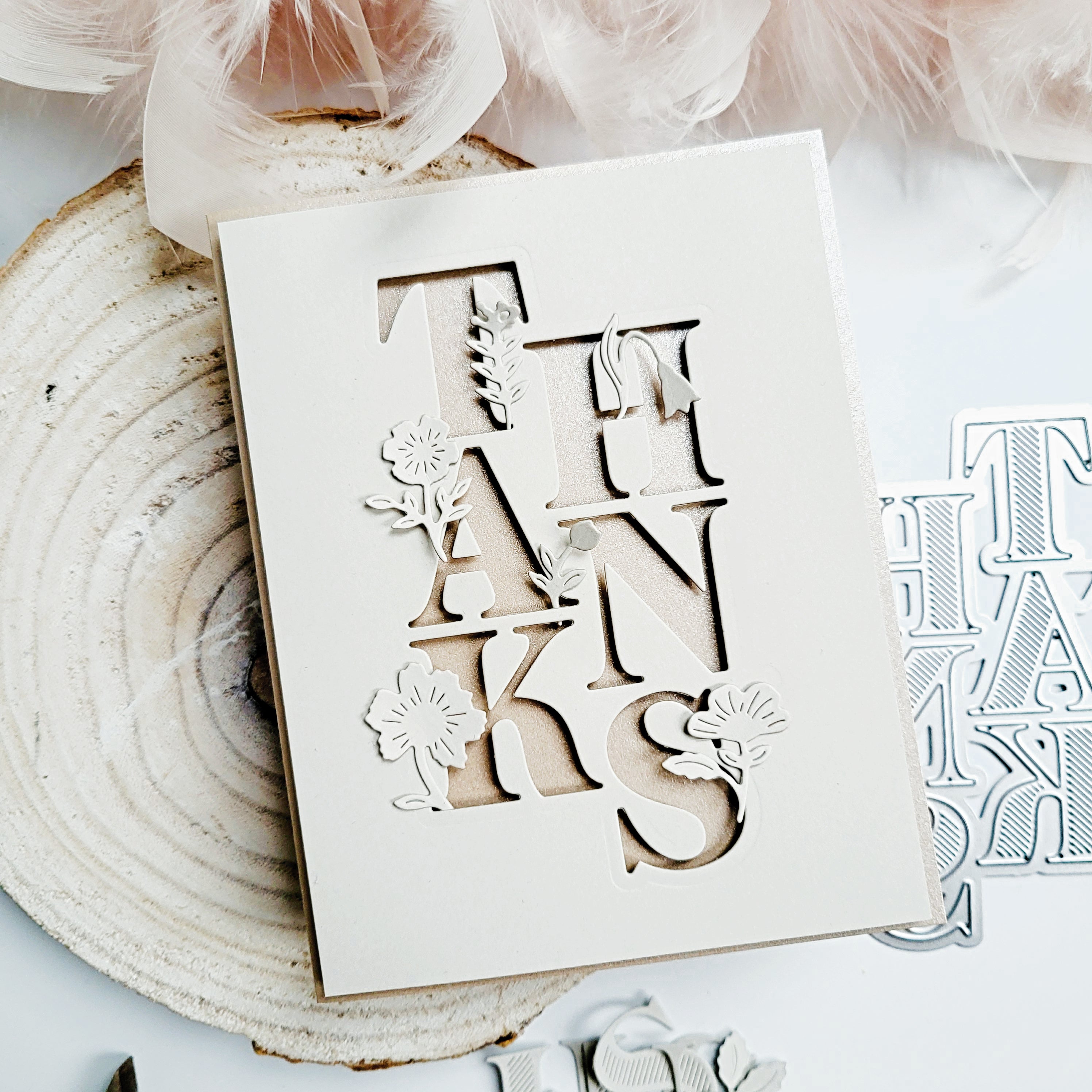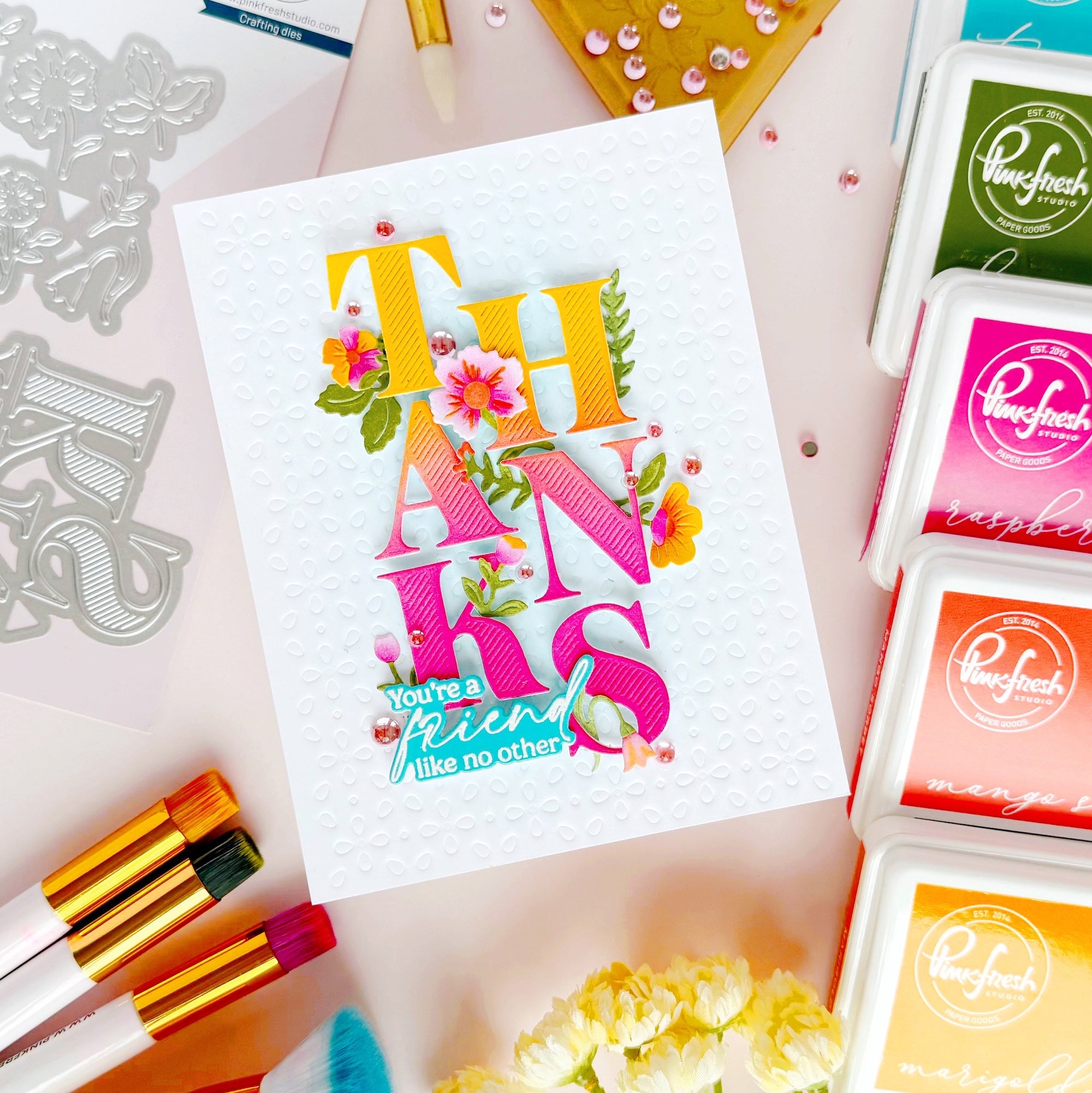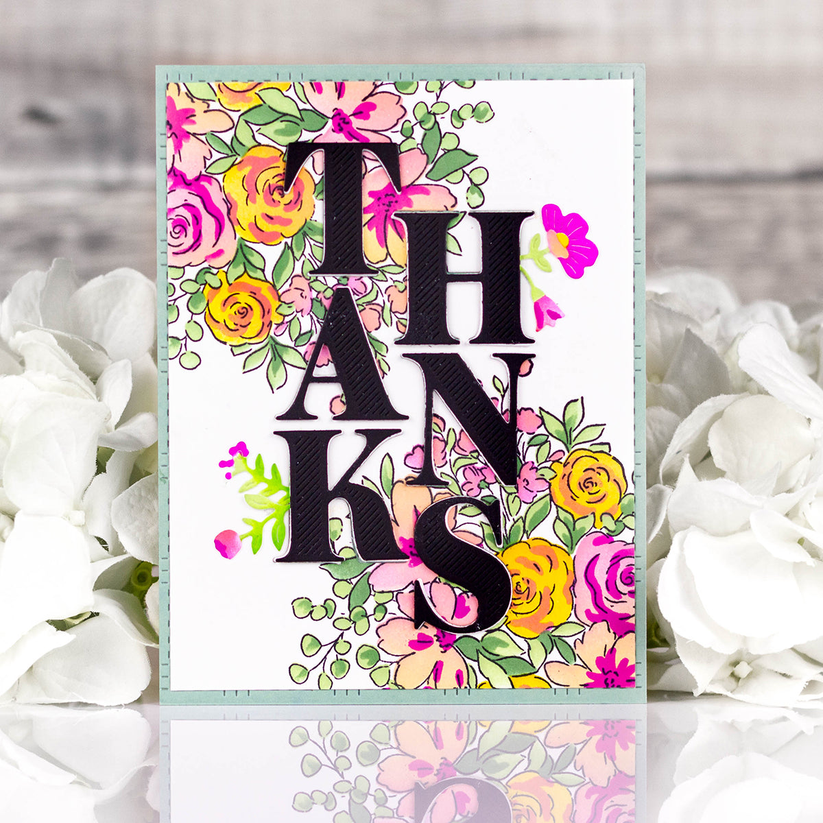Craft layered greetings with the Bloom of Thanks stencil and die (sold separately), designed by Inna Moreva. This versatile design combines bold stacked letters spelling “THANKS” with charming floral accents.