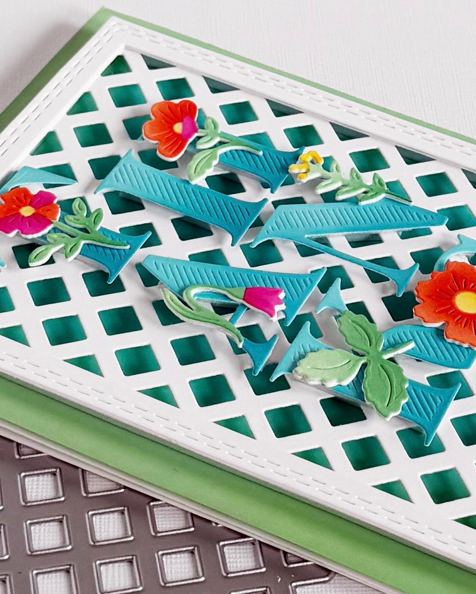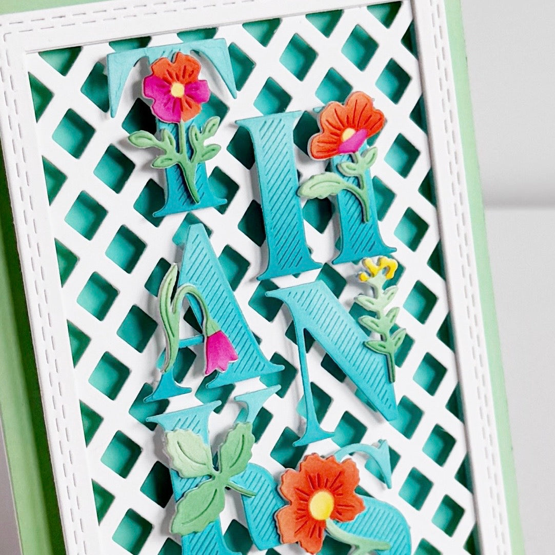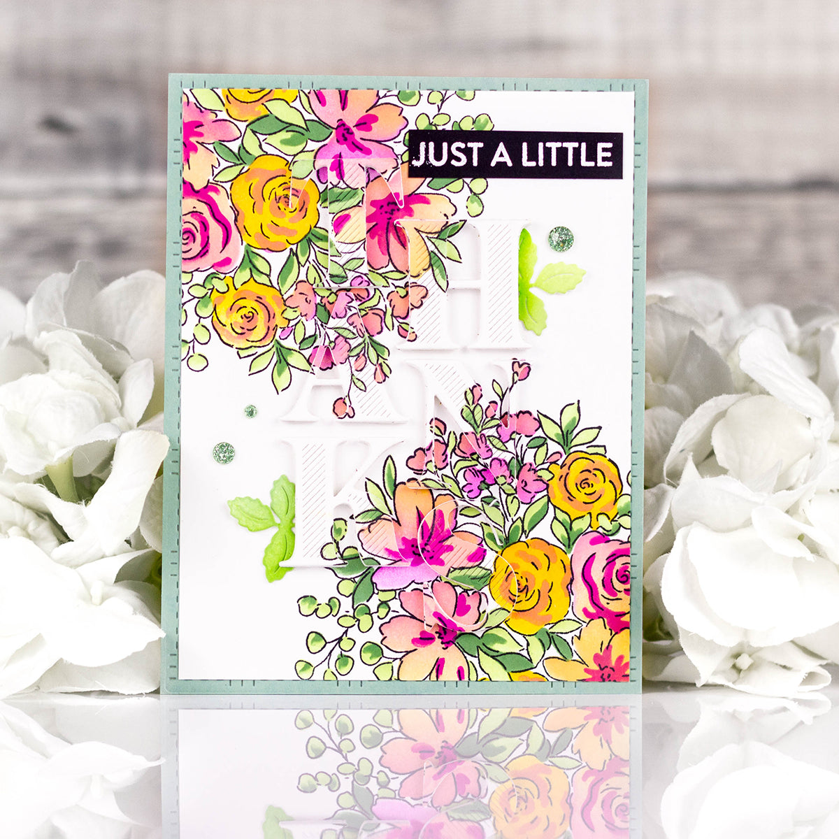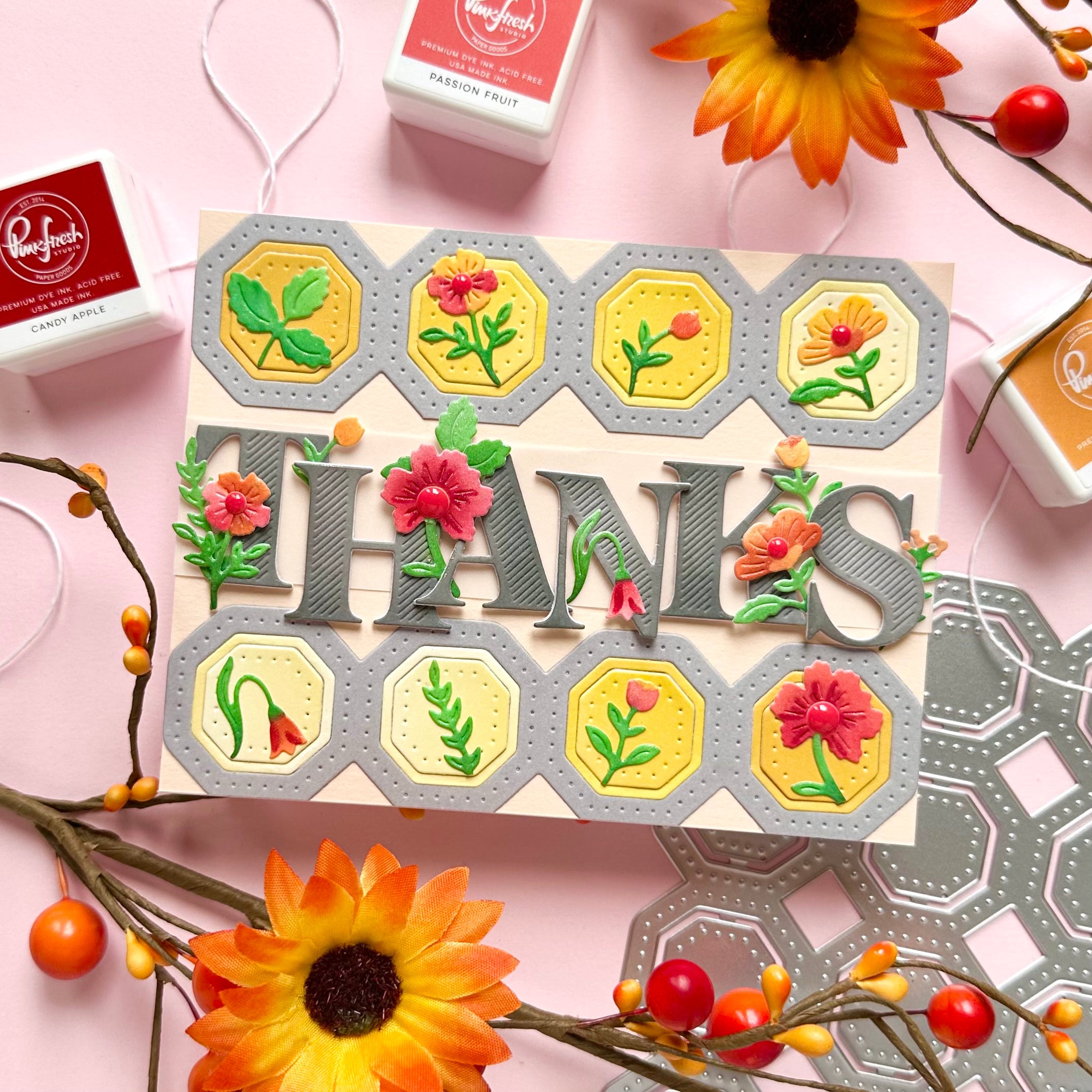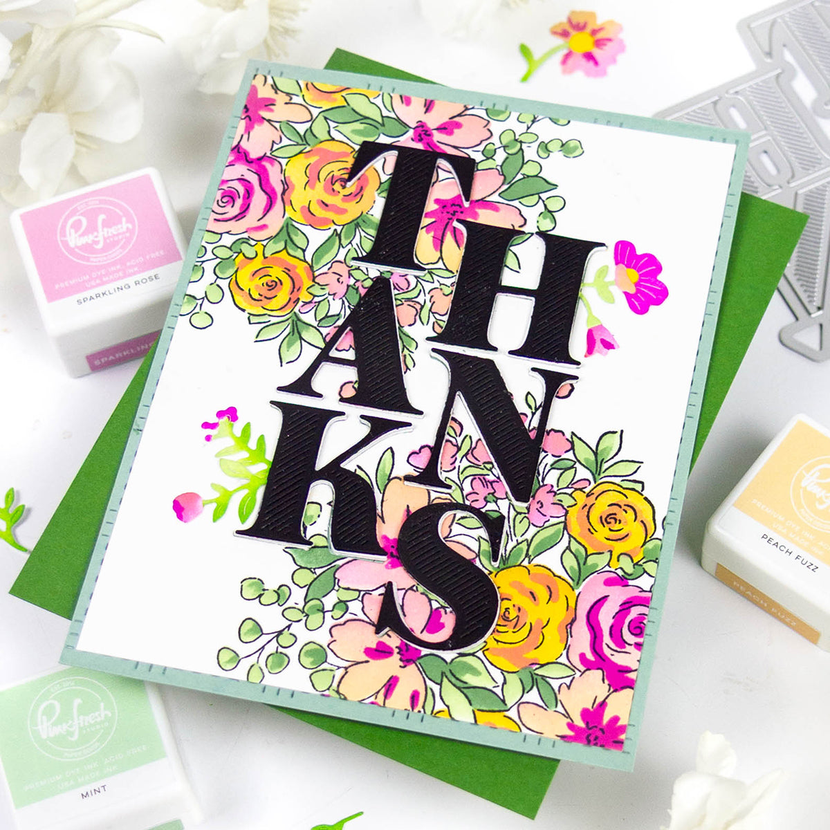 Craft layered greetings with the Bloom of Thanks stencil and die (sold separately), designed by Inna Moreva. This versatile design combines bold stacked letters spelling “THANKS” with charming floral accents.