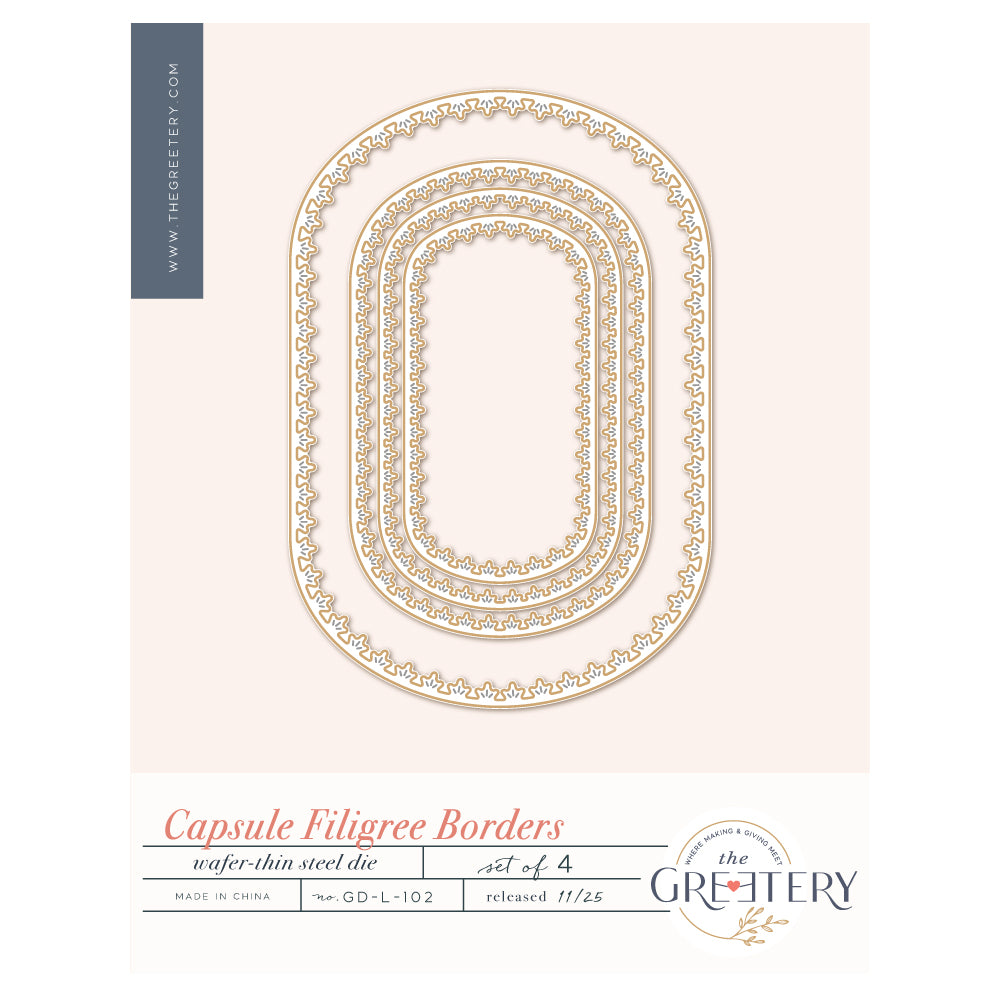This die set contains four filigree borders sized to coordinate perfectly with the four plain ovals included in the Capsule basics die