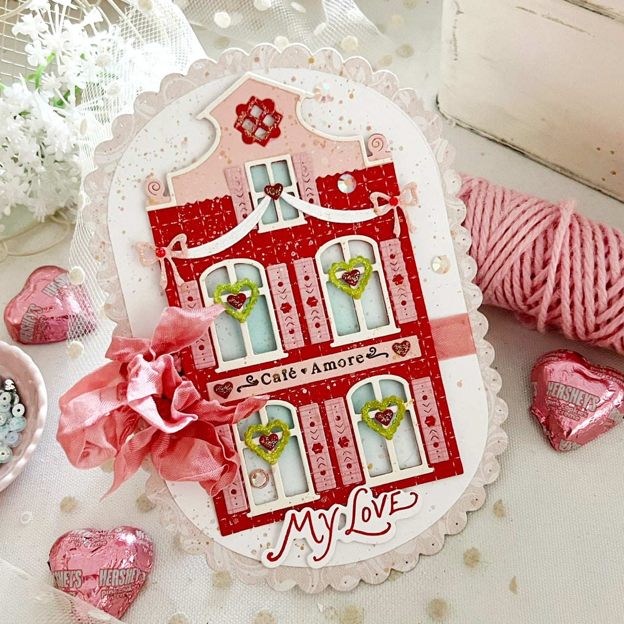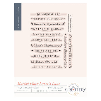 This mini stamp set is designed to coordinate with our Market Place dies. This fun set features store-front names for all kinds of love and Valentine-themed shops, designed to fit on the sign/label that is included in each of the Market Place No 1, No 2, and No 3 dies. Perfect for creating Valentine cards, tags, and treats!