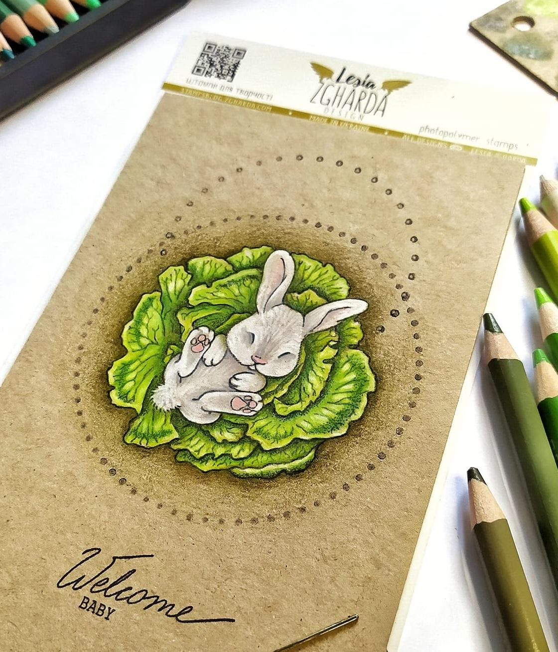 Perfect for new babies and birth cards, Easter or other occasions - this cute bunny nestled into a cabbage comes paired with a "Welcome Baby" sentiment.