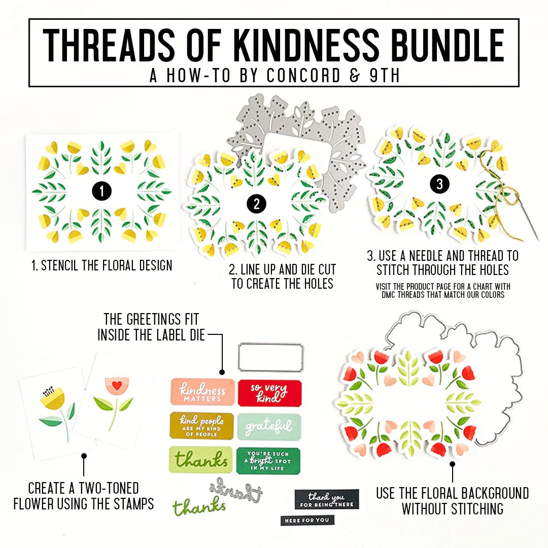 The Threads of Kindness Stencil Pack contains four 4.75" x 6" stencils that work together to create a large, charming floral focal point to add to your cards and other projects. Turn the image into a stitched piece when you use the coordinating Threads of Kindness Dies, a needle, and some thread! Also coordinates with the Threads of Kindness Stamp Set.